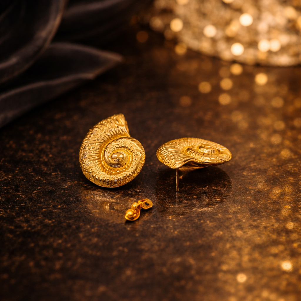 Inspired by seashell forms, these bold statement earrings feature anti-tarnish PVD gold plating on hypoallergenic stainless steel. Lightweight yet luxurious, they deliver a vintage artisan look with modern durability for everyday elegance.